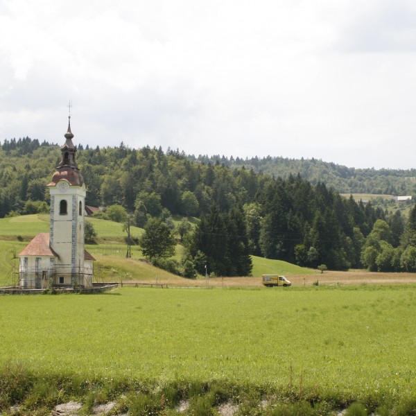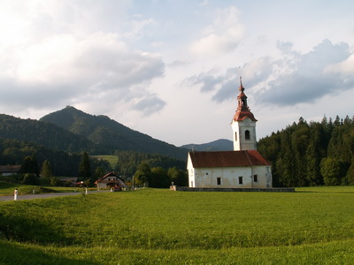 Cerkev stoji ob glavni cesti proti Gorenji vasi. Ladja je v notranjščini osmerokotna, ker so bili koti prvotne pravokotne ladje ob baročni predelavi v 18 stol. prezidani. Svod v prezbiteriju je preprežen z rebrovjem. Kot sklepniki služijo rozete in šcitki iz začetka 16. stoletja, kar nakazuje, da je cerkev lahko stala že pred letom 1526.