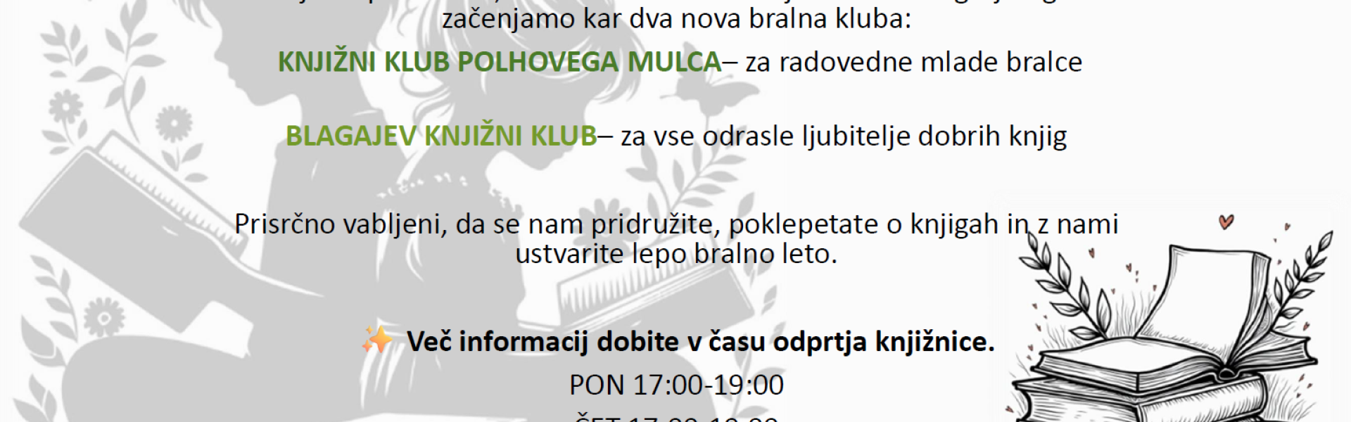 Prisrčno vabljeni, da se nam pridružite, poklepetate o knjigah in z nami ustvarite lepo bralno leto.